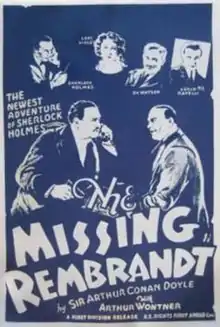 The Missing Rembrandt is a 1932 British mystery film directed by Leslie S. Hiscott and starring Arthur Wontner, Jane Welsh, Miles Mander, and Francis L. Sullivan.[1] It is considered a lost film.[2][3] The film was loosely based on the 1904 Sherlock Holmes story "The Adventure of Charles Augustus Milverton" by Arthur Conan Doyle.[4]