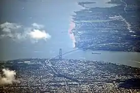 ![]() A TERRA satellite image of New York Harbor with The Narrows (in red), connecting Upper New York Bay to Lower New York Bay | |