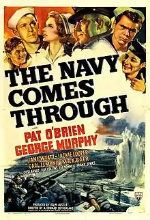 The Navy Comes Through is a 1942 American World War II film directed by A. Edward Sutherland. It stars Pat O'Brien, George Murphy and Jane Wyatt. Vernon L. Walker and James G. Stewart were nominated for an Oscar for Best Special Effects.[3] The film was based on Borden Chase's 1939 short story "Pay to Learn". The working titles of the film were Pay to Learn and Battle Stations. The film was the first RKO Pictures use of a new radio signal trademark that spelled out the word "victory." Prior to this, the studio's radio signal trademark spelled out "RKO."[4]