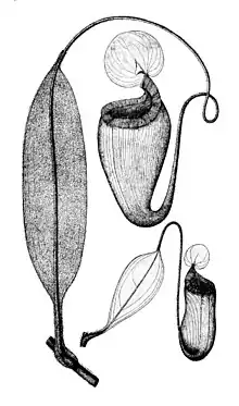 Danser recognised 65 species in total, of which 52 were given detailed treatments.[note a] This number included 17 newly described taxa: N. carunculata (later synonymised with N. bongso),[3][4] N. clipeata, N. dubia, N. ephippiata, N. fusca, N. inermis, N. insignis, N. leptochila (later synonymised with N. hirsuta),[4][5] N. mollis, N. paniculata, N. papuana, N. pectinata (later synonymised with N. gymnamphora),[3][4] N. petiolata, N. pilosa, N. spectabilis, N. tobaica, and N. tomoriana. All were described in great detail, with many accompanied by line drawings. Danser synonymised N. edwardsiana with N. villosa, N. hemsleyana with N. rafflesiana, and N. ramispina with N. gracillima;[1][6] all three were later reinstated as valid species.[4][7]