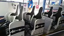 Trains2 trains with 5 cars. Riders are arranged 2 across in 2 rows for a total of 20 riders per train.
