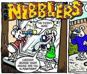 The Nibblers are fictional characters who have their own comic strip in the UK comic The Beano. Also known as 'The Bash Street Mice', The Nibblers were a community of mice who lived in a hole in the wall, and were always stealing food from Porky, the fat owner of the house. Porky and his cat Whiskers were repeatedly foiled in their attempts to catch The Nibblers, who nearly always had the last laugh. Like The Bash Street Kids, the Nibblers all had distinct personalities. Their names were: