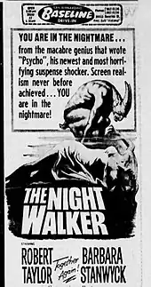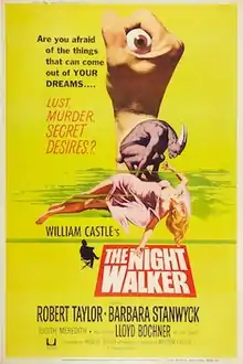 The Night Walker is a 1964 American psychological horror film[1][2] directed and produced by William Castle, written by Robert Bloch, and starring Robert Taylor, Judith Meredith, Lloyd Bochner and Barbara Stanwyck in her final film role. It follows the wife of a wealthy inventor who is plagued by increasingly disturbing nightmares, which escalate after her husband's death. It was the final black and white film made by Universal Pictures.[3]