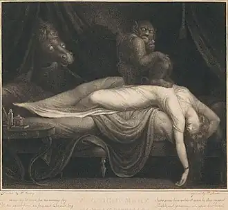 For contemporary viewers, the relationship of the incubus and the horse (mare) evoked the notion of nightmares. The work was likely inspired by the waking dreams experienced by Fuseli and his contemporaries, who found that these experiences related to folkloric beliefs like the Germanic tales about demons and witches that possessed people who slept alone. In these stories, men were visited by horses or hags, giving rise to the terms "hag-riding" and "mare-riding", and women were believed to engage in sex with the devil.[4] The etymology of the word "nightmare", however, does not relate to horses. Rather, the word is derived from mara, a Scandinavian mythological term referring to a spirit sent to torment or suffocate sleepers. The early meaning of nightmare included the sleeper's experience of weight on the chest combined with sleep paralysis, dyspnea, or a feeling of dread.[5] The painting incorporates a variety of imagery associated with these ideas, depicting a mare's head and a demon crouched atop the woman.