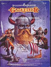 The Northern Reaches features guides Helfdan Halftroll, Onund Tolundmire, Saru the Serpent, and Dwalinn the Dwarf who provide a tour of the land known as the Northern Reaches.[1] The accessory details the Viking-style lands of Ostland, Vestland, and Soderfjord.[2] The thirty-two page Players Book provides a description the lands of the Northern Reaches, and rules for characters from this region, while the sixty-four page DM Book contains the history of the lands and their nations, and provides three adventure scenarios,[2] an epic campaign outline, and a system rune magic for clerics.[1]