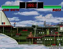 The stages are large and contain multiple platforms and obstacles the player can run and jump to navigate around.[1] The environments also employ thematic events and scenarios which can damage players and dynamically change the playing field over the course of the fight. For example, in an aquarium stage, the water tanks rupture during the fight and flood the stage. In the water are sharks which can hurt players.[1][4] In another stage set on a skyscraper, the players start at the top and scale down the building as it slowly explodes.[1] The other stages have gimmicks as well, such as planes and boats that shake and sway.[4]