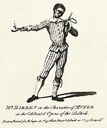 In contrast to Cervantes's miser-centred story, The Padlock is centred on the old man's servant, a black man named Mungo from the West Indies, who also provides a large part of the comedy. The part was played by a white man in blackface, making The Padlock an early example of this practice, but not the earliest as claimed by some sources.[2] Mungo is a stereotype: a musical, heavy drinking, money-grubbing servant who speaks in an approximation of the black dialect of West Indies slaves. Mungo's master beats him with a rattan cane and makes him sing and dance on cue. The servant's pretense at being an opera singer constitutes the aria for Act 2. He is normally obsequious to whites, but in moments of drunkenness or solitude, he becomes impudent: