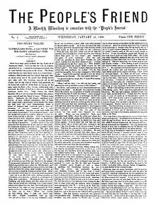 The People's Friend is a British weekly magazine founded by John Leng on 13 January 1869[2] as an offshoot of The People's Journal[3] and currently published by D. C. Thomson & Co. Ltd. Its tagline is "The famous story magazine".[4] It was originally a monthly magazine but became a weekly magazine in 1870, and had its first illustrated cover on 11 May 1946.[2]