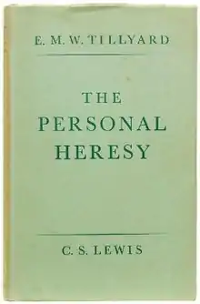 The Personal Heresy is a series of articles, three each by C.S. Lewis and E. M. W. (Eustace Mandeville Wetenhall) Tillyard, first published on 27 April 1939 by Oxford University Press and later reprinted, also by Oxford University Press, in 1965. The book has been reprinted in 2008 by Concordia University Press with an Introduction by Lewis scholar Bruce L. Edwards and a new Preface by the editor, Joel D. Heck. The central issue of the essays is whether a piece of imaginative writing, particularly poetry, is primarily a reflection of the author's personality (Tillyard's position) or is about something external to the author (Lewis's position). The two positions may be summarized briefly as the subjective position (Tillyard) and the objective position (Lewis). In general, Lewis attempts to keep poetry within the reach of the common person, while Tillyard thinks of the poet as a person who is "a cut above the common person."