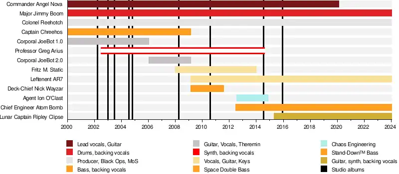 In February 2009 The Phenomenauts lineup changed again, with JoeBot 2.0 and Captain Chreehos leaving. Two new members took their place: Leftenant AR-7 on guitar and vocals, and Deck Chief Nick Wayzar playing bass.[37]