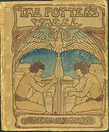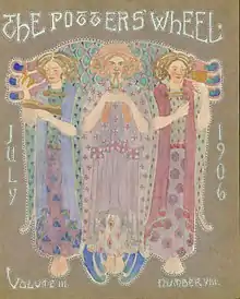 The group produced The Potters Wheel magazine monthly from November 1904 to October 1907.[3] Only one copy of each magazine was produced each month,[2] "hand-lettered and hand-illustrated" by The Potters themselves.[16] Contents included poetry, fiction, photographs, and needlework.[3][16] The thick, textured pages of the hand-bound magazine were decorated with "border designs, illuminations, and watercolors".[2] The cover art often sported "mythological or fantastical scenes, in tones resembling stained glass".[2]