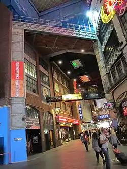 In 2000, Printworks was opened by Sir Alex Ferguson and Lionel Richie as the venue for a variety of clubs, leisure facilities and eateries.[22][23] The new 365,000-square-foot facility is set over four floors.[9][24] The new building features a twenty-screen UCI cinema complex (subsequently bought by Odeon and, in 2017, by Vue Cinemas[25]) which includes North West England's first IMAX screen, a Nuffield Health fitness club, a Hard Rock Cafe restaurant and Cargo nightclub.[9][20][21] The external lighting facing Exchange Square has been changed numerous times since opening.[24]