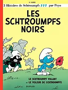 The Purple Smurfs (original French title: Les Schtroumpfs noirs, "The Black Smurfs") is the first album of the original French-language Smurfs comic series created by Belgian artist Peyo. It was first published as an album in 1963, but the stories it contained had already been published in Spirou magazine. The main story Les Schtroumpfs noirs was first published in number 1107 (July 2, 1959) as the first "mini-récit" in the magazine. This was a special supplemental page which readers would remove and fold up in order to create a small booklet. Mini-récits were not included when the issues of Spirou were collected in the quarterly hardcover volumes, so this story is absent from volume 72 of Spirou, though the page containing instructions for creating the booklet is there.[1]