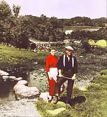 In 1952 A. H. Weiler of The New York Times viewed the film "as darlin' a picture as we've seen this year," with "dialogue that is as tuneful as a lark's song."[18] In another contemporary review, the entertainment trade paper Variety called the picture "beautifully filmed" and wrote that "Wayne works well under Ford's direction," but found the 129-minute running time "unnecessary."[19] Harrison's Reports described the film as "a delightful and rollicking comedy melodrama of Irish life, directed with skill and acted with gusto by a fine cast."[20] Richard L. Coe of The Washington Post declared it "a complete jim-dandy ... The photography is glorious and Victor Young's score, inspired by folk airs, is a complete joy for an exuberant, vigorous picture."[21] Philip Hamburger of The New Yorker was not so taken with the film, writing, "If am to believe what I saw in John Ford's sentimental new film, The Quiet Man, practically everybody in Ireland is just as cute as a button," adding, "Mr. Ford's scenes of the Irish countryside are often breathtaking ... but the master who made The Informer appears to have fallen into a vat of treacle."[22] In contrast to contemporary reviews of the film, editorial writer Frances Mulraney saw the film as "misogynistic" and "outdated"—due not just to the psychological and physical control the male characters exert over the female characters, but also for the female lead's gender-based expectations of her husband.[23]