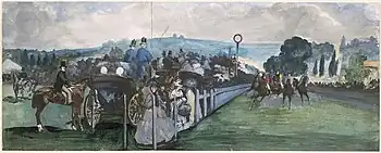 The Races at Longchamp is an 1866 painting by the French artist Édouard Manet. The Impressionist painting depicts the ending of the Second Grand Prix de Paris at Longchamp. It is currently in the collection of the Art Institute of Chicago.[1][2] This painting is one of four depictions of the same subject that Manet created over four years.[3] The painting reflects the rise of horse racing in France, following the influence of the British.[4] The work is thought to be the first painting to present horses coming directly toward the viewer, and it uses various techniques to reduce the sense of depth.[3]