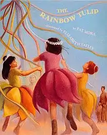 The Rainbow Tulip is a 1999 historical fiction children's picture book by Pat Mora and illustrated by Elizabeth Sayles. Published by Viking Children's Books in 1999, it follows the story of a young girl named Estelita.[1] Estelita is the only Hispanic student in the first-grade class and feels very different than the rest of her classmates. Her heritage is different than many of the other children and she struggles with looking and sounding different than the other kids. Estelita is bilingual and speaks English at school while her parents speak only Spanish. She loves her family but notices that even her mother stands out from the other mothers in her class. Estelita embraces her heritage but doesn't always love feeling so different than everyone else. With the help of a colorful costume and a joyous dance around a maypole, Estelita learns to embrace standing out from her classmates. Estelita's thoughts and feelings are at the forefront of this story as she finds comfort with who she is. [2]