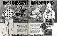 The Ramblin' Kid is a 1923 American silent Western film directed by Edward Sedgwick and featuring Hoot Gibson and Laura La Plante.[1] This may be a lost film.[1] It was based on the novel The Ramblin' Kid by Earl Wayland Bowman. The novel would later be filmed as a talkie in The Long Long Trail (1929) which also starred Gibson.