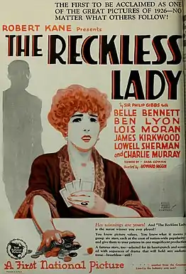 The Reckless Lady is a 1926 American silent drama film directed by Howard Higgin and starring Belle Bennett, Lois Moran, James Kirkwood, and Lowell Sherman.[1]