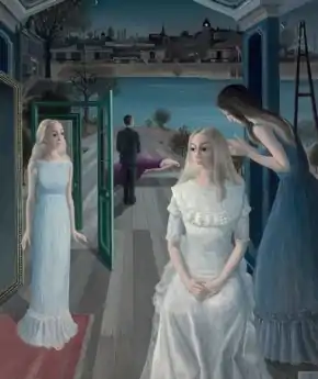 In Paul Delvaux's treatment of the myth, four women and one man can be seen on an outdoor porch or boardwalk. The three women in the foreground are covered by a roof. Foremost and largest in the image is a blonde woman with large eyes and a lacy white dress, passively seated with her clasped hands in her lap. To the left in the picture is a very similar blonde woman who stands on a small, red carpet, flanked by a large mirror and several freestanding doors. She is dressed in light blue shift, her arms are along her body and her hands are slightly raised, as she appears to observe the woman at the centre. To the right in the picture is a woman in a blue evening dress and dark hair; she may be Clytemnestra, Iphigenia's mother.[1] In the background is a man in a dinner suit, turned away from the viewer and overlooking a woman who lies down, is draped in purple cloth and has one breast exposed. Behind the boardwalk is a river and on the opposite shore a freight train and a nightly cityscape.[2]