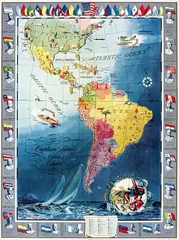 Between 1942 and 1944, The Sea Hound was produced with Nelson A. Rockefeller's Office of the Coordinator of Inter-American Affairs and was part of a national program to strengthen inter-American relations. Broadcast five times a week, the serial related the adventures of Captain Silver and his sidekick Jerry as they pursued Nazi agents throughout the Western hemisphere.[4]: 47 Every episode took place in a different Latin American country. To educate young listeners about each country's geography and strategic importance, the producers created Captain Silver's Sea Chart, a map that identified the vital products, flags and national heroes of each Latin American republic.[4]: 51 Some 200,000 complimentary copies of Captain Silver's Sea Chart were distributed.[4]: 145