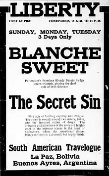 The Secret Sin is a surviving 1915 silent film drama produced by Jesse Lasky and distributed by Paramount Pictures. It was directed by Frank Reicher and starred Blanche Sweet, Thomas Meighan and Sessue Hayakawa. This film often thought lost actually survives at the Library of Congress and along with a few other surviving Lasky features from 1915-17 allows viewing of Blanche Sweet during her Paramount period immediately after she left D. W. Griffith's employ. In this film Sweet has a rare chance to act in a double exposure scene playing two different characters.[1][2][3]