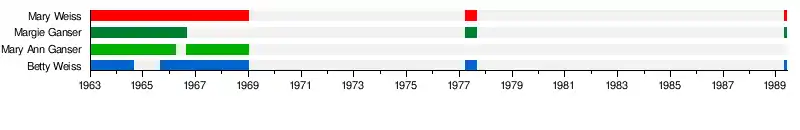 Betty Weiss had a daughter in 1964, necessitating her absence from the group during this period. She was the only member of the group to have a child (who was raised with the help of Betty's brother George Weiss, who died in 1998). Betty Weiss also married and held several jobs and now lives and works on Long Island.