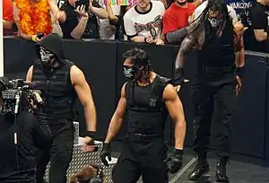 The Shield[7] was a professional wrestling stable in WWE that consisted of Dean Ambrose, Roman Reigns, and Seth Rollins. Their original characters were mercenaries for CM Punk; however, they quickly became mainstay main-event names.[8] The group debuted on November 18, 2012 at the Survivor Series pay-per-view.[5] The Shield was a dominant force in six-man tag team matches with an undefeated televised streak lasting from December 2012 to May 2013, during which they scored a victory at WrestleMania 29.[9] In May 2013 at Extreme Rules, all three members of The Shield won a championship, with Ambrose winning the United States Championship while Rollins and Reigns captured the WWE Tag Team Championship.[10] Rollins and Reigns were WWE Tag Team Champions until October 2013, and Ambrose was United States Champion until May 2014, which was a record reign for the WWE version of the championship.[11][12] As a Shield member, Reigns gained prominence by setting and equaling elimination records at the 2013 Survivor Series and the 2014 Royal Rumble events.[13][14]