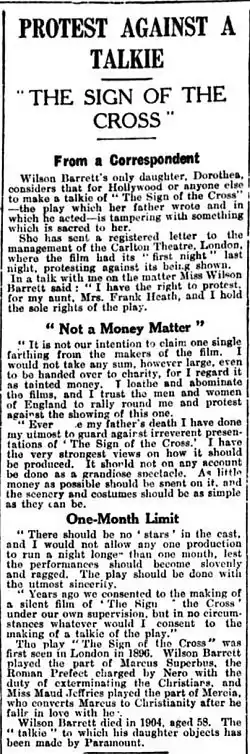 - 1 2 Protest Against a Talkie: "The Sign of the Cross", The Citizen, (Tuesday, 31 January 1933), p.8.