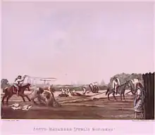 Although The Slaughter Yard is a story, it is based on some elements of fact. English-speaking memorialists described the setting (the south Matadero shown in the Vidal image) and their accounts corroborate many of Echeverría's details.[8][9][10] The clergy indeed upheld Rosas' dictatorship.[note 10] It was indeed compulsory to display rosista emblems including "Death to the savage unitarios.[note 11] The butchers in the slaughter yards were indeed staunch Rosas supporters and did supply thugs for his Mazorca.[11] The Mazorca did use the corncob as an instrument of torture.[12] Further, according to Gutiérrez[13]
