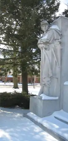 The eyes are drawn to the centered white marble stairs which lead up to the main part of the monument. At the top of the stairs is the dominating feature of the installation. Taft's oversized Classical female figure stands with her arms outstretched, clutching a laurel wreath in each hand. Behind her is an exedra which was designed by the architects Pond and Pond.[1] The exedra extends around the installation and to either side of the female sculpture are built-in benches. Above the benches are bronze plaques honoring veterans of the Civil War and the Spanish–American War;[3] above the individual war plaques is bronze plating that reads, "Ogle County Honors Her Sons." Flanking the dominant sculpture are two soldiers atop pedestals, one facing north and the other facing south. Tafts's soldiers were cut from marble obtained in the U.S. state of Georgia.[1] The Soldiers' Monument was constructed, on the approval of the Ogle County Board in 1916, for no more than $21,000. Today (2007), this example of the work of Lorado Taft is estimated to be worth over $1,000,000.[3]