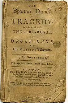 The Spartan Dame is a 1719 tragedy by the Irish writer Thomas Southerne. It was inspired by a story from Plutarch's Life of Aegis and was originally written as early 1687, but faced a long period of censorship and revision. The Drury Lane managers chose to revive it at a time of tension with the Stanhope-led government Whigs over licensing issues, and may have selected it because its plot subtly allowed them to demonstrate sympathy with the opposition Whigs led by Robert Walpole following the recent Whig Split.