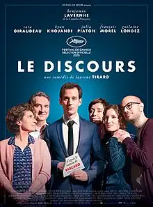 The Speech (French: Le Discours) is a 2020 Franco-Belgian comedy film written and directed by Laurent Tirard, based on the 2018 novel of the same name by Fabcaro. It stars Benjamin Lavernhe and Sara Giraudeau.[2] The film was selected for the 2020 Cannes Film Festival. It screened at the Angoulême Francophone Film Festival on 1 September 2020. It was released in France on 9 June 2021.