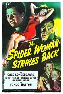 The Spider Woman Strikes Back is a 1946 American horror film starring Gale Sondergaard, with a running time of 59 minutes. Despite the similar title and role played by Sondergaard, the film is not a sequel to the Sherlock Holmes film, The Spider Woman. In The Spider Woman, Sondergaard's character is named Adrea Spedding.[1] This time it is Zenobia Dollard.[2][3]