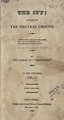 The Spy: a Tale of the Neutral Ground is a novel by American writer James Fenimore Cooper. His second novel, it was published in 1821 by Wiley & Halsted. The plot is set during the American Revolution and was inspired in part by the family friend John Jay.[1] The Spy was successful and began Cooper's reputation as a popular and important American writer.
