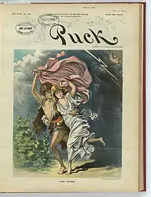 When it was first exhibited at the Salon in Safa's House in 1880, there was much speculation amongst Cot's contemporaries as to the subject the painter meant to allude to. Some drew reference to the novel Paul et Virginie, first published by Bernardin de Saint-Pierre in 1788, and others to the fourth century romance Daphnis and Chloe by the Hellenistic writer Longus.[2][3] Evidence for the first interpretation comes from the specific motif of the couple running from the rain and covered by a billowing drapery corresponding to a famous and often illustrated scene in Paul et Virginie: