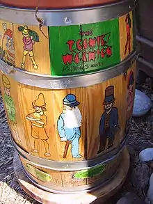 The Teenie Weenies is a comic strip created and illustrated by William Donahey that first appeared in 1914 in the Chicago Tribune and ran for over 50 years.[1][2][3] It consisted of normal-size objects intermingled with tiny protagonists.[1] The comic strip characters were two inches tall[1][2] and lived under a rose bush.[3] They lived with "real world" size materials made from discarded objects like hats, jars, barrels, kegs, and boxes – all of which were gigantic to them.[3]