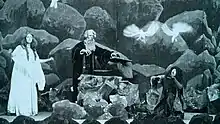 The British Film Institute describes Stow's The Tempest as "Comfortably the most visually imaginative and cinematically adventurous silent British Shakespeare film". Unlike William Kennedy Dickson's 1899 film version of King John and Charles Urban's 1905 film of The Tempest, both of which were simply films of Herbert Beerbohm Tree's stage productions, Stow's film was a condensed version of the entire play set specifically for the camera and tells the backstory (the film's first four scenes are set before the play starts) of how Prospero arrived on the island, his first encounter with Caliban and the discovery of Ariel.[4] Characters such as Duke Antonio are only sketched in while others such as Stephano and Trinculo do not appear at all and Percy Stow may have presumed that his audience would be familiar enough with the story to not require additional detail.[4][5] The Tempest was filmed in the studio and on location.[3][6]