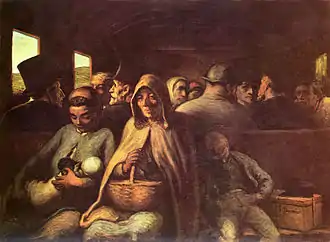 The Third-Class Carriage (French: "Le Wagon de troisième classe") is the name of at least three oil paintings entitled made by the French painter Honoré Daumier. In a realistic manner, Daumier depicts the poverty and fortitude of working class travellers in a third class railway carriage. One oil-on canvas version, dated to c. 1862–1864 but left unfinished, is in the collection of the Metropolitan Museum of Art in New York, and a similar but completed painting dated to c. 1863–1865 is in the National Gallery of Canada in Ottawa. A third oil-on-panel version, dated to c. 1856–1858, with a different arrangement of the main three figures, is held by the Fine Arts Museums of San Francisco.