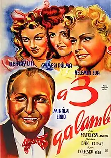 The Three Doves (Hungarian: A három galamb) is a 1944 Hungarian period comedy film directed by Frigyes Bán and starring Ernö Mihályi, Éva Kelemen and Lili Kertay.[1][2] It was shot at the Hunnia Studios in Budapest. The film's sets were designed by the art director Imre Sörés.