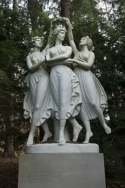 The Three Graces is a nearly life-size, figurative Carrara marble outdoor sculpture group located on the historic Oldfields estate on the campus of the Indianapolis Museum of Art (IMA), in Indianapolis, Indiana. The neoclassical marble sculpture depicts the Three Graces, minor goddesses of the Greco-Roman pantheon. The group consists of three women frontally oriented, standing in a row upon a base. The sculpture is modeled after a c. 1797 sculpture by Antonio Canova.[1][2][3]