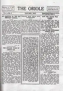 According to the first issue of The Oriole, the very first newspapers were published in 1921 with no names, in order to advertise the school and increase enrollment. There were only two issues published in 1921, and the first monthly publication was created in January 1922.