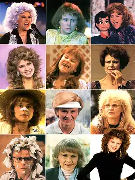 An array of original and diverse characters was created for Ullman to perform. Extensive makeup, wigs, teeth, and body padding were used, sometimes rendering her completely unrecognizable. One original character created solely by Ullman back in Britain was uprooted for the show: long-suffering British spinster Kay Clark. Kay was based on a real woman who worked in a Midlands bank that Ullman kept in touch with long after leaving Britain for the United States.[15] "Kay" would ask her about Hollywood on the telephone; Ullman would subsequently do the voice she heard on the other line to her dog.[lower-alpha 1] She had been obsessed with spinsters ever since she was a small child, and kept a mental file on them.[lower-alpha 2] She never saw "Kay" and imagined what she looked like. Tracey Ullman Show costume designer Jame Ruhm suggested a drooping bust and cellulite-covered hips for the character. Ruhm created a costume complete with "hydraulic pistons".[16] "Tracey is really, really interested in what her characters look like," revealed Ruhm. "She is constantly going around collecting pictures of people and coming to me and saying, 'I want to do a character dressed like this!' I file that in my memory, and then we'll get a script and I'll say, 'That character that you wanted to do, can we use it on this?' She'll say, 'Yeah!' And we'll go."[17] "It's a real thrill to me that someone like Kay can be famous in America." For other characters, she drew upon people she either knew or celebrities for inspiration. "I based one character on Maggie Smith, which the script supervisor suggested. I remember her in California Suite saying, 'Well, I don't care if I didn't win the fucking Oscar.'... It sounded good. It made me laugh, and then I felt that I could do the character."[17] She based the character Francesca on a neighbor, an awkward teenaged girl, who would come to visit her in her kitchen and would sheepishly stand in the corner. "I wanted to portray painful adolescence, but not an adolescent that was spoiled. I'd seen so many that were just, 'Like I really want to go to the movies, and you're totally stupid.' I didn't want to play a horrible kid."[lower-alpha 3] Ullman believed in progressing the characters, adamant that they didn't stagnate. "You have to advance the characters [...] you have to find new situations for them [...] They have to do something or say something or grow as people. And they have to be unusual."[lower-alpha 4] Like Kay, another character created and performed by Ullman first for British television (Three of a Kind) and then adapted for the Fox show was impoverished housewife Betty Tomlinson.