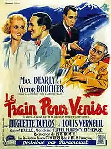 The Train for Venice (French: Le train pour Venise) is a 1938 French comedy film directed by André Berthomieu and starring Max Dearly, Huguette Duflos and Victor Boucher. It is based on the 1937 play of the same title written by Louis Verneuil and Georges Berr.[1] Three years later an American adaptation of the play, My Life with Caroline, was produced starring Ronald Colman and Anna Lee.