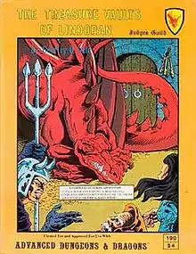 The Treasure Vaults of Lindoran was written by Geoffrey O. Dale, with art by Kevin Siembieda, and was published by Judges Guild in 1980 as a 32-page book.[1] Geoffry O. Dale is the pen name used by Paul Elkmann.[4]