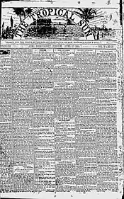 The Tropical Sun was South Florida's first newspaper, established in 1891 and based in Juno, Florida and later in West Palm Beach. Founded by Guy Metcalf, the paper was published in Juno, which was the county seat of Dade County (which then extended from modern-day Martin County south to Dade's southern boundary at Florida Bay). The Tropical Sun was the pioneer's tie to the outside world, and later covered the events of the Florida land boom of the 1920s and its subsequent bust in preceding the Great Depression in South Florida. Byrd Spilman Dewey served as its first columnist, writing "The Sitting Room" column under the pen name "Aunt Judith." It also documents the growth of tourism, the presence of malaria in Florida prior to World War II, and other issues related to the struggles of the developers of south Florida's Atlantic coast. The only rival to the Tropical Sun was The Miami Metropolis, which eventually became The Miami News, and The Miami Evening Record. The Tropical Sun was published as a weekly for most of its history but, also, as a semiweekly between 1903 and 1906. Miami and Dade County saw an increase in tourists after 1906 when Henry Flagler's railroad opened service to Key West. Before this date, tourist traffic to Key West would have involved travel by city. The location of The Tropical Sun's offices in Juno, Florida, "set back from the (railroad) track some thirty feet and from the wharf about fifty yards"[1] is telling of both the newspaper's and south Florida's relationship with and their reliance on tourism. Between 1891 and 1895, The Tropical Sun was published in Juno, Florida. From 1895 to 1926, it was published in West Palm Beach, Florida. For a time beginning in 1914, the newspaper published both as a weekly under The Tropical Sun title and as a daily under the title, the Daily Tropical Sun.