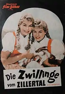 The Twins from Zillertal (German: Die Zwillinge vom Zillertal) is a 1957 West German comedy film directed by Harald Reinl and starring the twins Isa Günther and Jutta Günther, Joachim Fuchsberger and Karin Dor.[1] It takes its title from the Zillertal Valley in Tyrol. It was shot in Eastmancolor at the Bavaria Studios in Munich with location shooting in Austria at the Schloss Matzen, Krimml Waterfalls, Zell am Ziller and Innsbruck. The film's sets were designed by the art director Arne Flekstad. It was part of the post-Second World War boom in Heimatfilm.