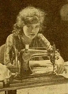 Still from the American drama film The Unknown Quantity (1919) with Corinne Griffith with a sewing machine