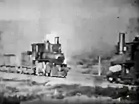 Siegmund Lubin reportedly spent over $25,000—a monstrous sum in 1914 for a single action sequence—to purchase two old coal-fired locomotives, the needed freight and passenger cars, and to stage the spectacle.[8] Despite the expense, Lubin justified it as an investment, for the studio later used the same wreck footage in at least four other productions.[8][lower-alpha 4] Fielding deployed 30 cameramen with 12 different cameras to film the collision, minimizing the chances of losing optimal footage of the one-take event due to either malfunctioning equipment or other factors.[8] No one was aboard the trains except two "experienced railroad engineers" hired by the director, who instructed them to jump off their respective trains "a minute before the impact". Following the crash, Fielding also filmed needed passenger-rescue scenes around the smoking wreckage.[12]