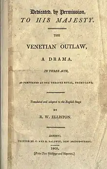 The Venetian Outlaw is an 1805 play by the British writer and actor Robert William Elliston. It premiered at the Theatre Royal, Drury Lane in London on 26 April 1805.[1] [2] The cast included James Grant Raymond as The Doge, William Barrymore as Count Orsono, Robert William Elliston as Vivaldi, William Powell as Alfieri, William Dowton as Calcagno, George Bartley as Carnevaro, George Cooke as Spalatro and Nannette Johnston as Rosara. The published play was dedicated by Elliston to George III. It was based on an 1801 French play L'Homme à Trois Visages by René-Charles Guilbert de Pixérécourt, which also inspired Rugantino by Matthew Lewis.[3]