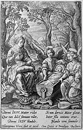 The print itself was of Dutch origin, from a book entitled Jesu Christi Dei Domini Salvatoris nostra Infantia ("The Infancy of our Lord and Saviour Jesus Christ"), a collection of prints and accompanying verse by Flemish engraver Hieronymus Wierix (1553–1619).[3] The verse accompanied an image titled "The Virgin Sewing While Angels Rock Her Son to Sleep", a woodcutting of the infant Jesus asleep in a cradle, rocked by two angels, while the Virgin Mary sits alongside engaged in needlework.[6]